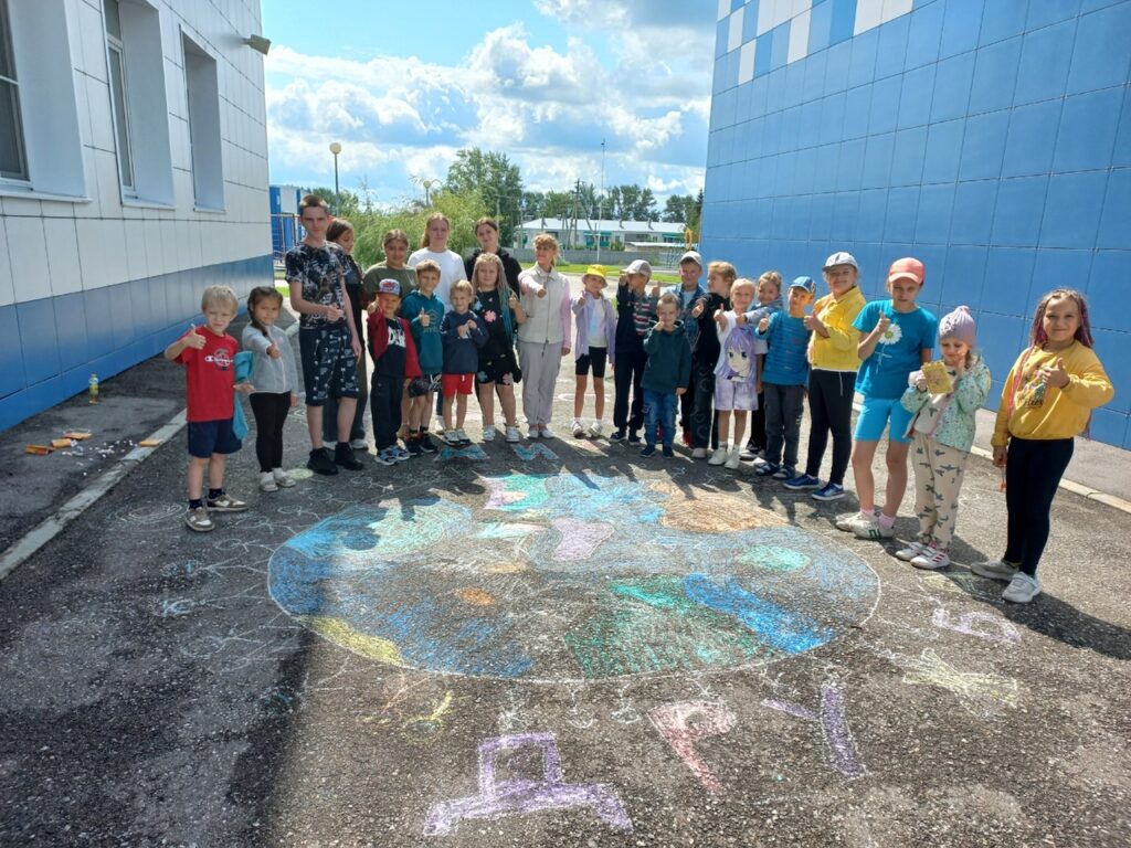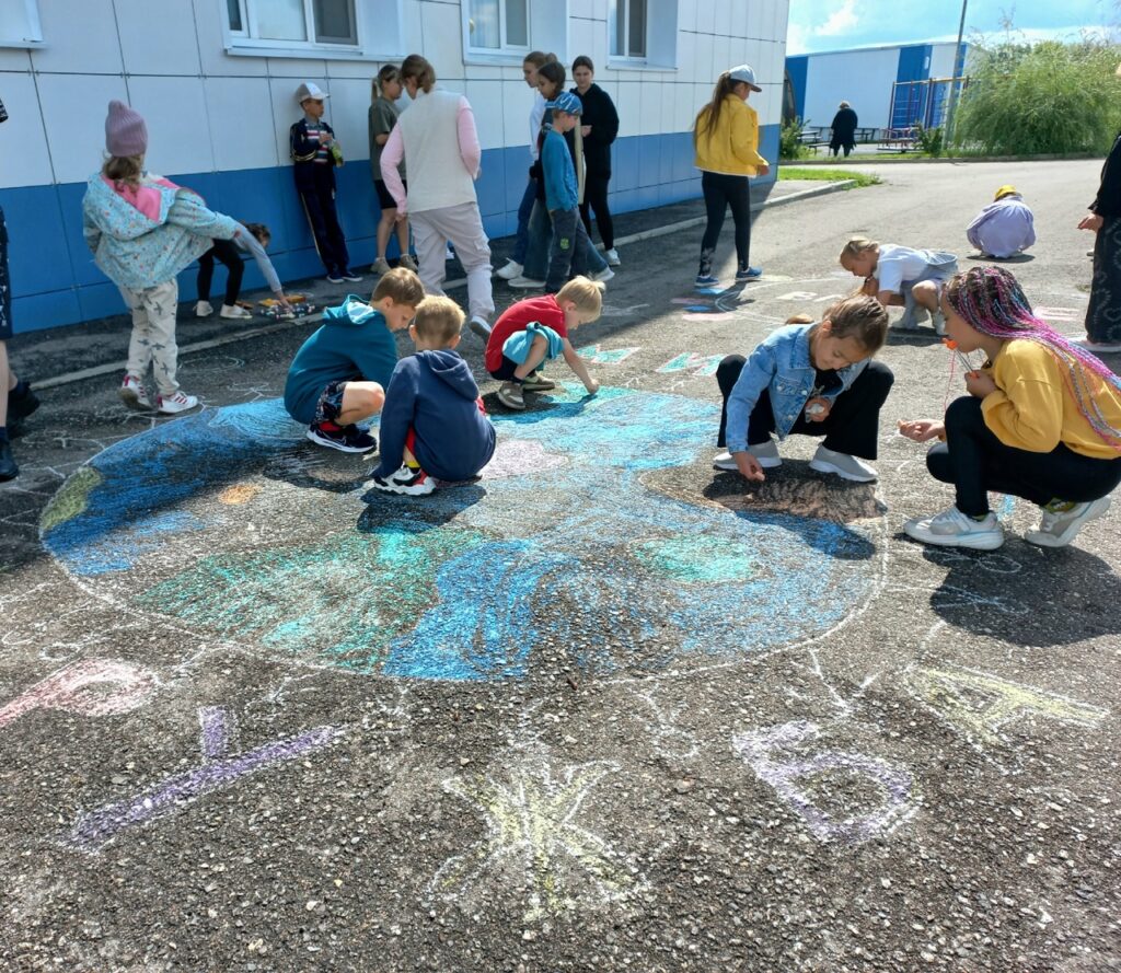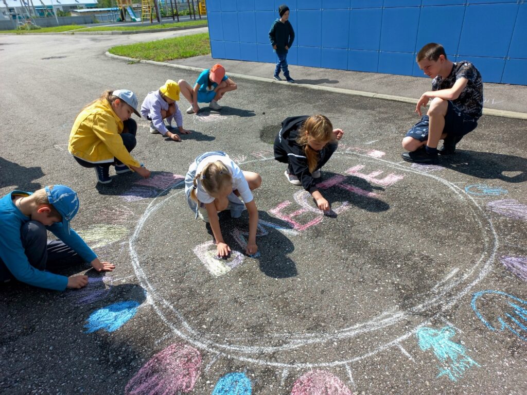 В лагере “Созвездие талантов” ребята с помощью цветных мелков выполнили на асфальте тематические рисунки!